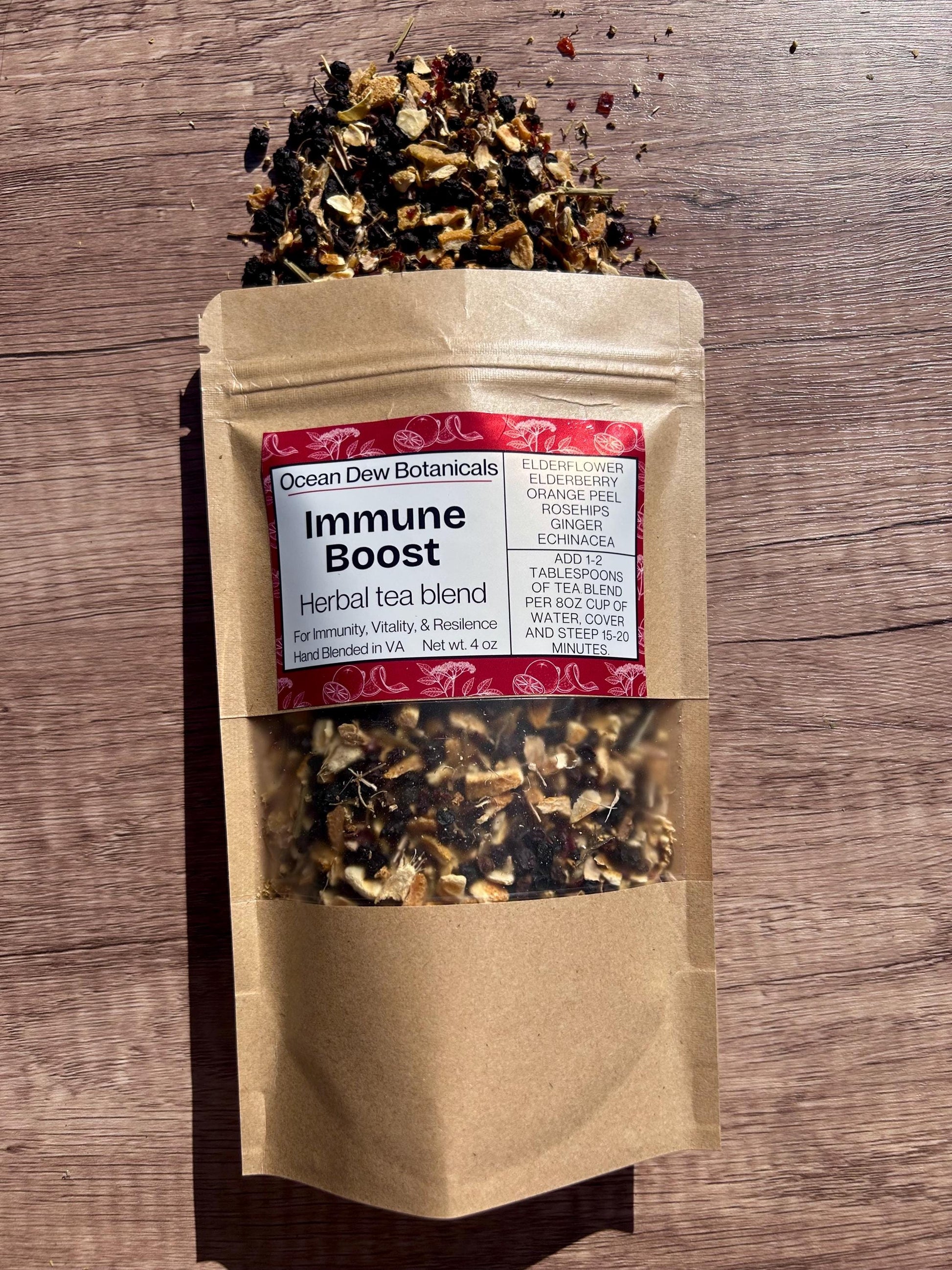 Support your body’s natural defenses with this Immune Boost tea blend—a vibrant mix of herbs and fruits known for their immune-supporting properties. Perfect for seasonal transitions or anytime you want to strengthen your body from the inside out, this blend is a delicious and soothing ally for overall wellness. Elderflower and Elderberry provide gentle, immune-enhancing support while offering a naturally sweet, floral flavor. Echinacea helps strengthen the body’s defenses, supporting resilience against everyday stressors. Rosehips and Orange Peel add a bright, citrusy zing packed with vitamin C, and Ginger brings warmth while soothing the digestive system and promoting circulation.