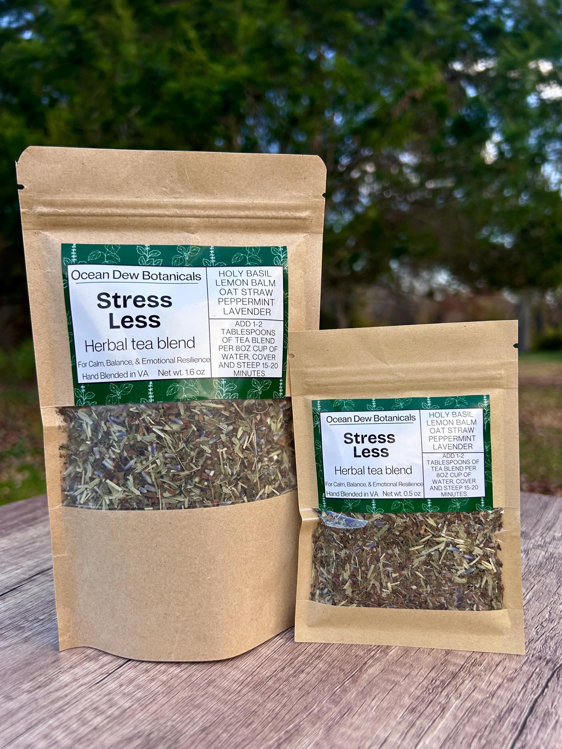 When life feels heavy or the mind won’t slow down, reach for this Stress Less tea blend. Crafted to calm the nervous system, uplift the spirit, and bring you back to center, this soothing mix of adaptogenic and relaxing herbs is like a deep breath in a cup. Holy Basil is a sacred adaptogen that helps the body respond to stress with balance and grace, easing fatigue while gently uplifting mood. Lemon Balm and Peppermint bring a refreshing calm that cools tension and supports both mind and digestion. Lavender offers a peaceful floral note, relaxing the heart and soothing anxious thoughts, while Oat Straw nourishes and restores the nervous system from the inside out.