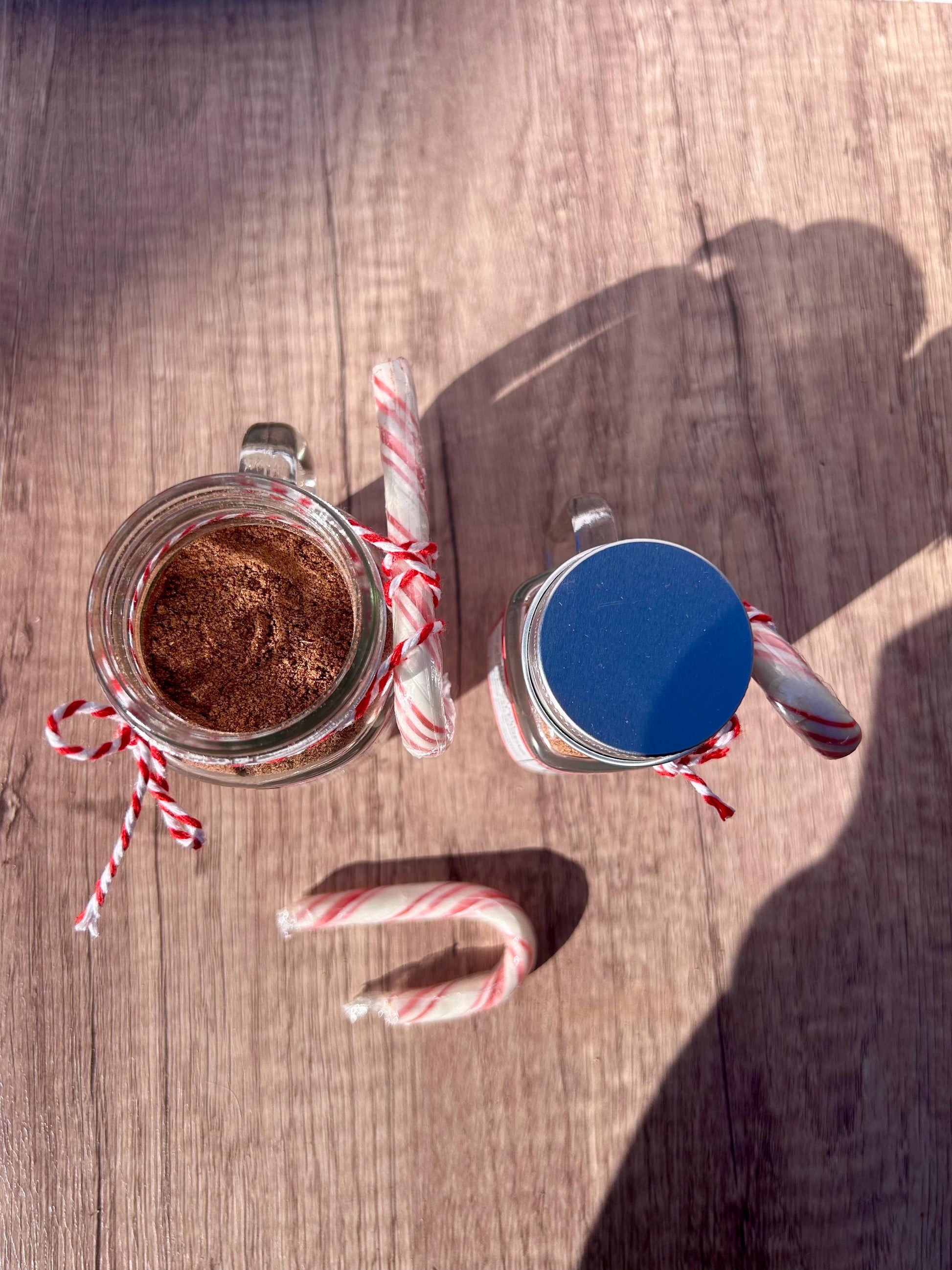It comes in two sizes, a 1 oz mason jar or a 2 oz mason jar. Both jars have a little handle and can be reused or recycled after use. Jars come with a small vegan candy cane tied to the side (Yum Earth brand).