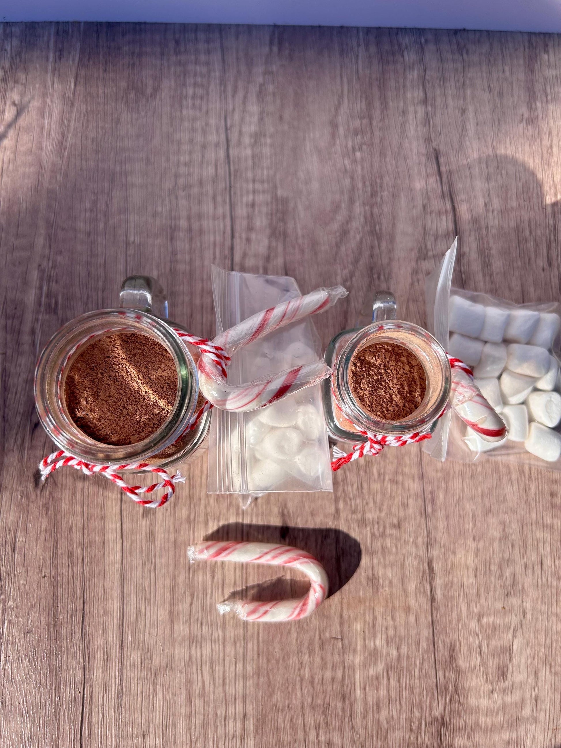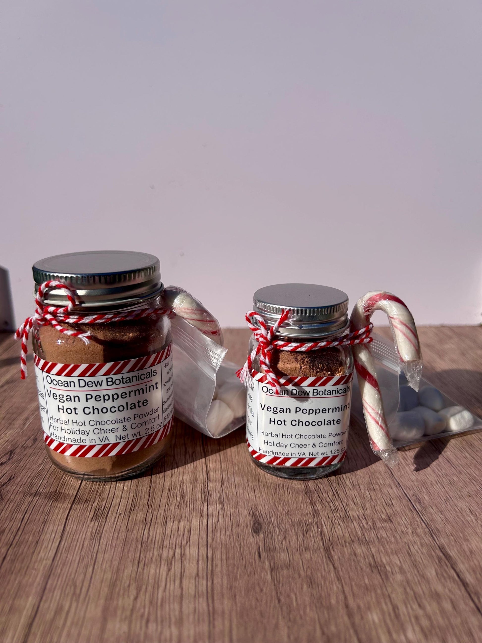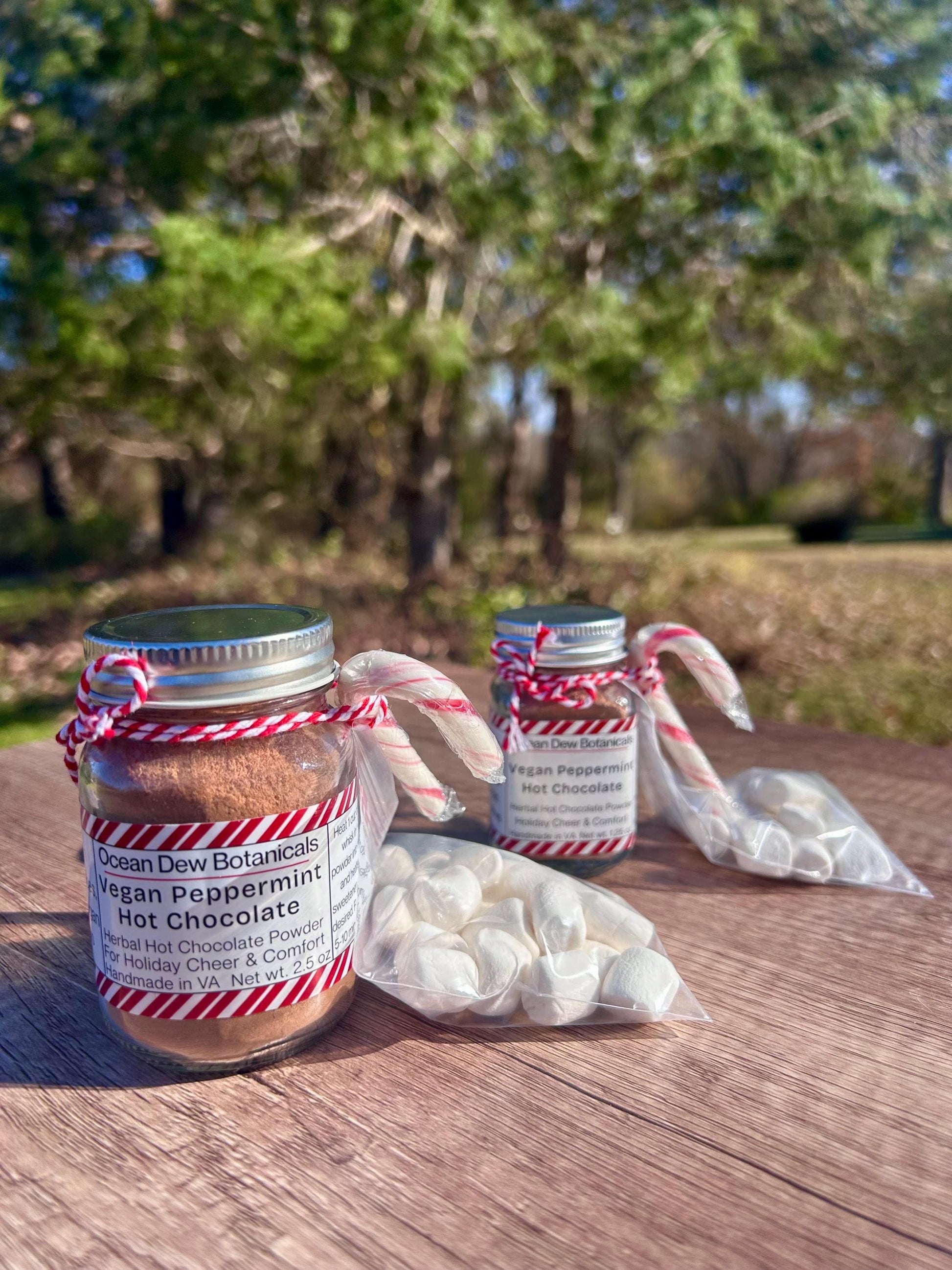 It comes in two sizes, a 1 oz mason jar or a 2 oz mason jar. Both jars have a little handle and can be reused or recycled after use. Jars come with a little bag tied to the side containing vegan marshmallows (Dandies brand) and a vegan candy cane (Yum Earth brand).